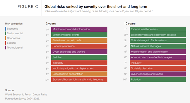 The findings below show the global risks by severity over the short and longer term. They highlight that whilst technological, societal and geopolitical disruptions may require more immediate attention (next 2 years), the environmental crisis represents the most significant long-term challenge (next 10 years).
